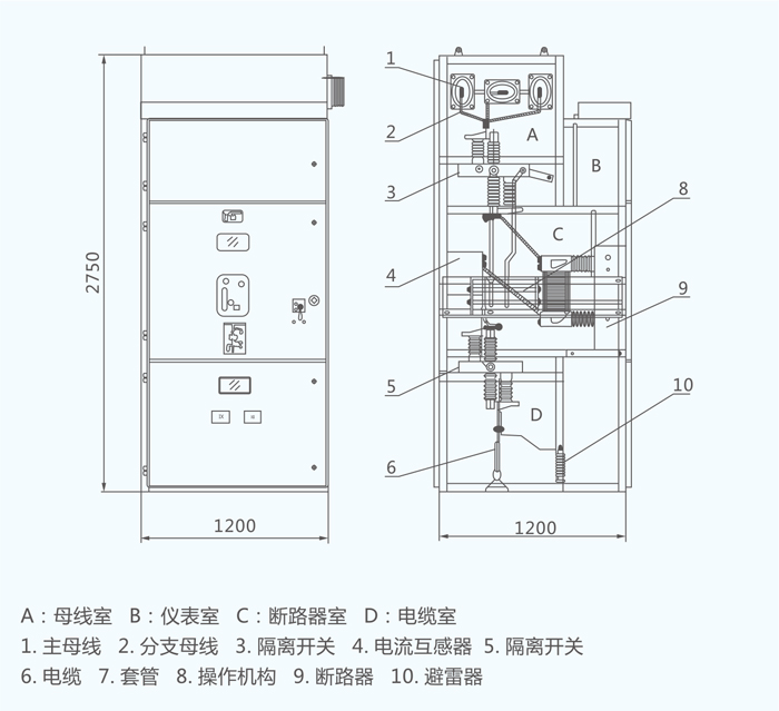 3.带电体被密封在金属外壳内,柜间主母线以绝缘套管支持和作为柜间封护。