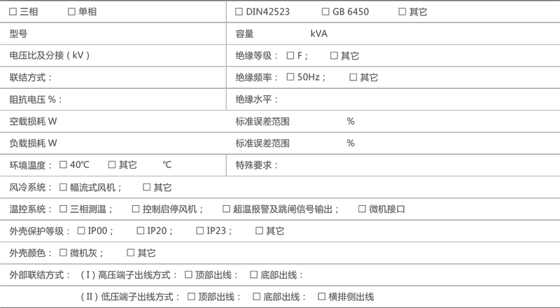 特殊要求:如环境温度、海拔高度、相数、频率、有载分接开关、绝缘水平、是否带小车、带电流互感器等。