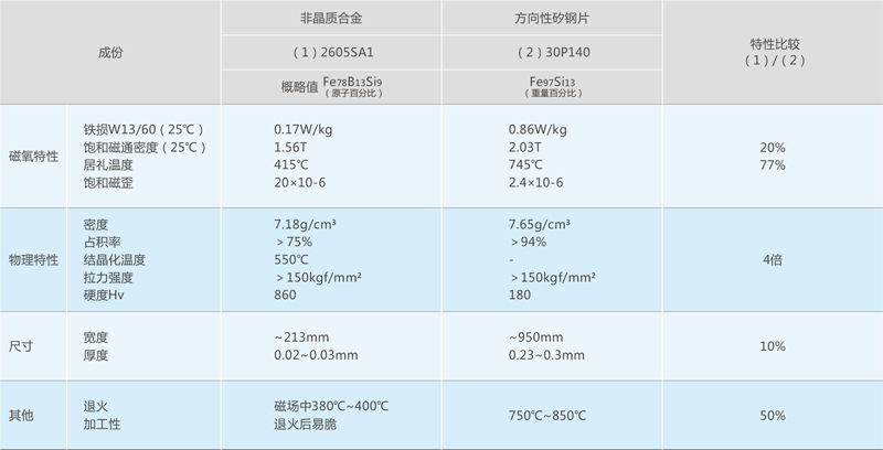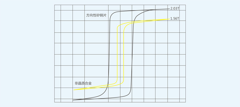 非晶质合金材料与普通方向性矽钢片磁化特性曲线比较,图中曲线所包围的封闭面积,代表磁性材料在磁场循环中以热的形态散失的能量,由图中可明显的开出,非晶质合金与矽钢片二者之封闭面积相差很大,根据实测的数据,二者之差异可高达70%至80%,即变压器如以非晶合金材料替代矽钢片铁心材质时,即可节省70%~80%的空载电力(铁心)损耗。