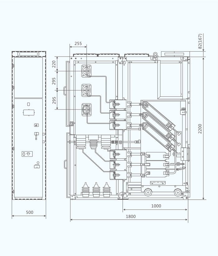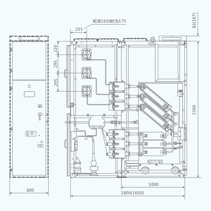 电缆室可安装电流互感器、接地开关、避雷器和电缆,电缆接线端的高度距地大于700mm。当柜宽为500mm时,电流互感器为后、中、前布置,当柜宽为600mm时,电流互感器为左、中、右布置。