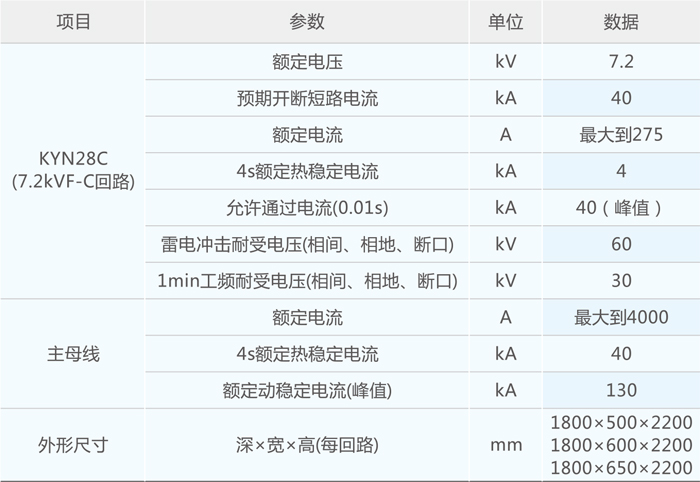 1.开关柜基本技术参数见表