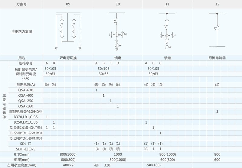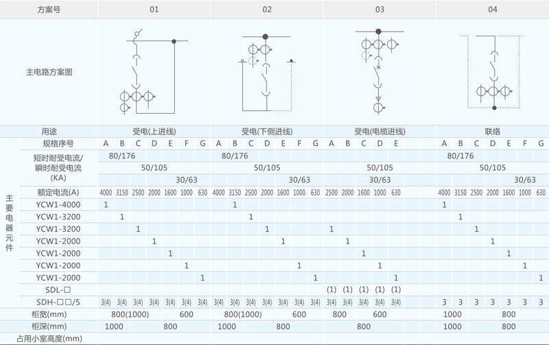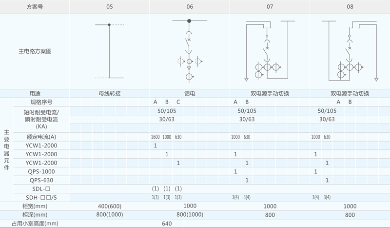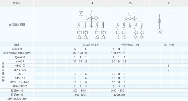 开关设备主电路方案共32组118个规格(见表2),不包括由于辅助电路的控制与保护的变化而派生的方案和规格。包括了发电、供用电和其它电力用户的需要,额定工作电流为4000A,适合2500KVA及以下的配电变压器选用。