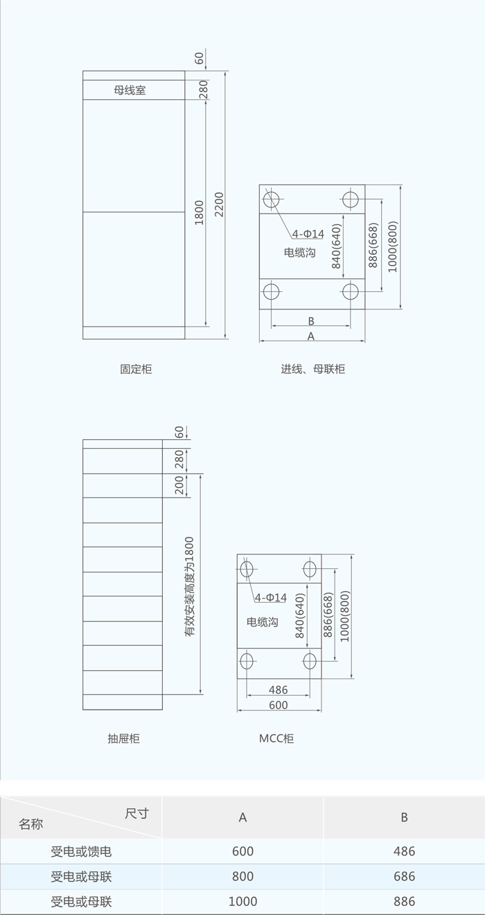 2)抽屉单元高度模数为200mm,分为1/2单元、1单元、2单元、3单元四个尺寸系列。单元回路额定电流630A以下。